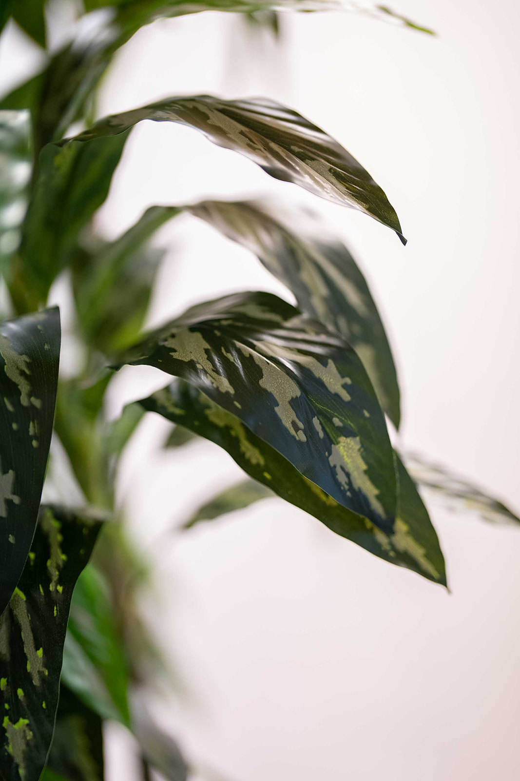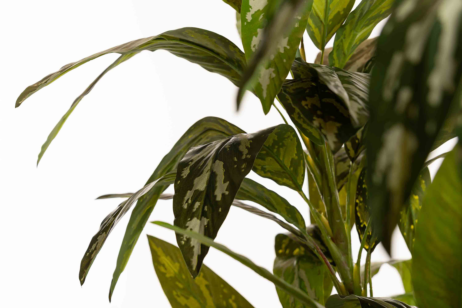 Bladene er grønne med gule spetter. Denne planten skaper stemning.