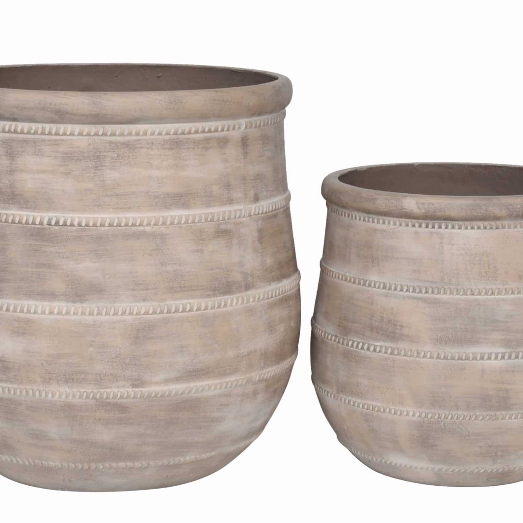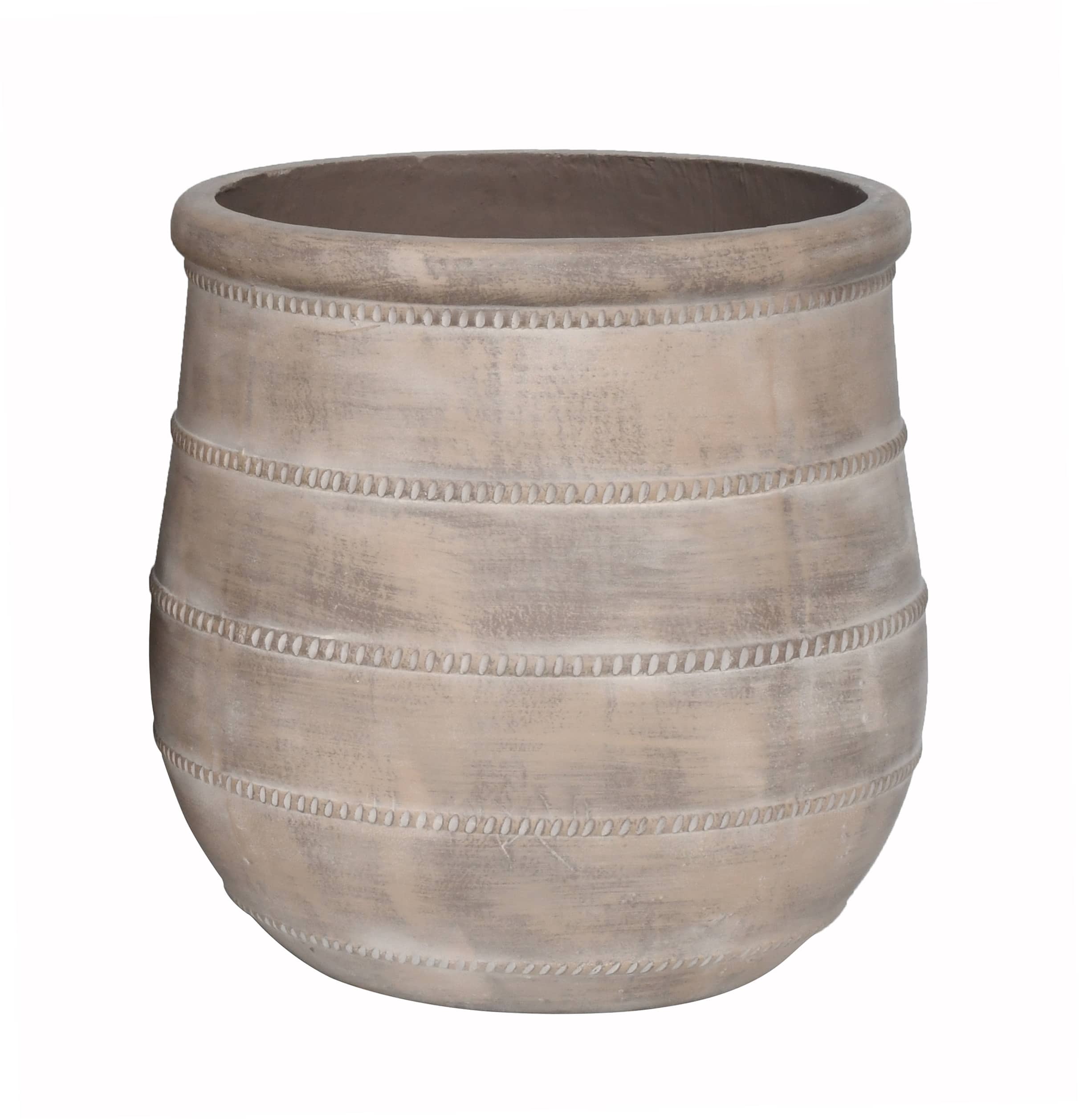Florals Rope er en nydelig potteserie. Vi har den nå inne i en beige farge som kan minne litt om en lys terrakotta. Det som er så fint med denne enormt store potten er at den allikevel er smidig på grunn av sin feminine form og sitt litte relieff av dekor, de klassiske båndene som løper rundt og skaper litt romantisk uttrykk. Altså stor og søt potte på samme tid, som tåler store trær og planter. Denne potten står støtt både inne og ute. Vi er stolte av våre serier i ficonstone materialet som er en blanding av lettsement, glassfiber og sandmel. Blandingen gir en sterk potte i lettvekt klassen, som samtidig beholder tyngden og stabiliteten i seg.