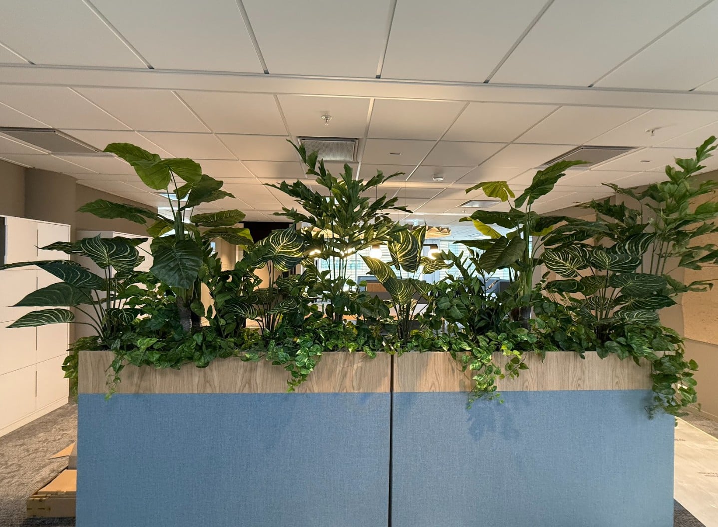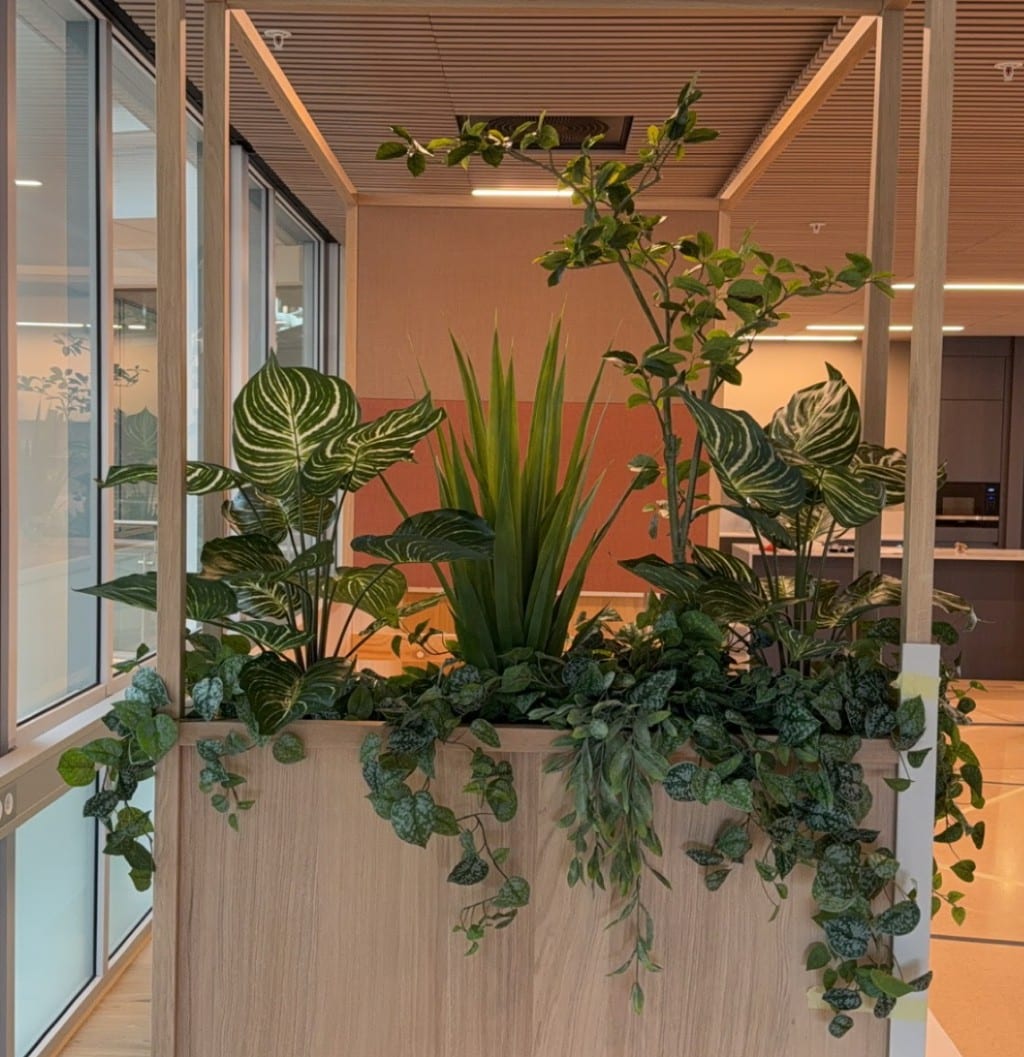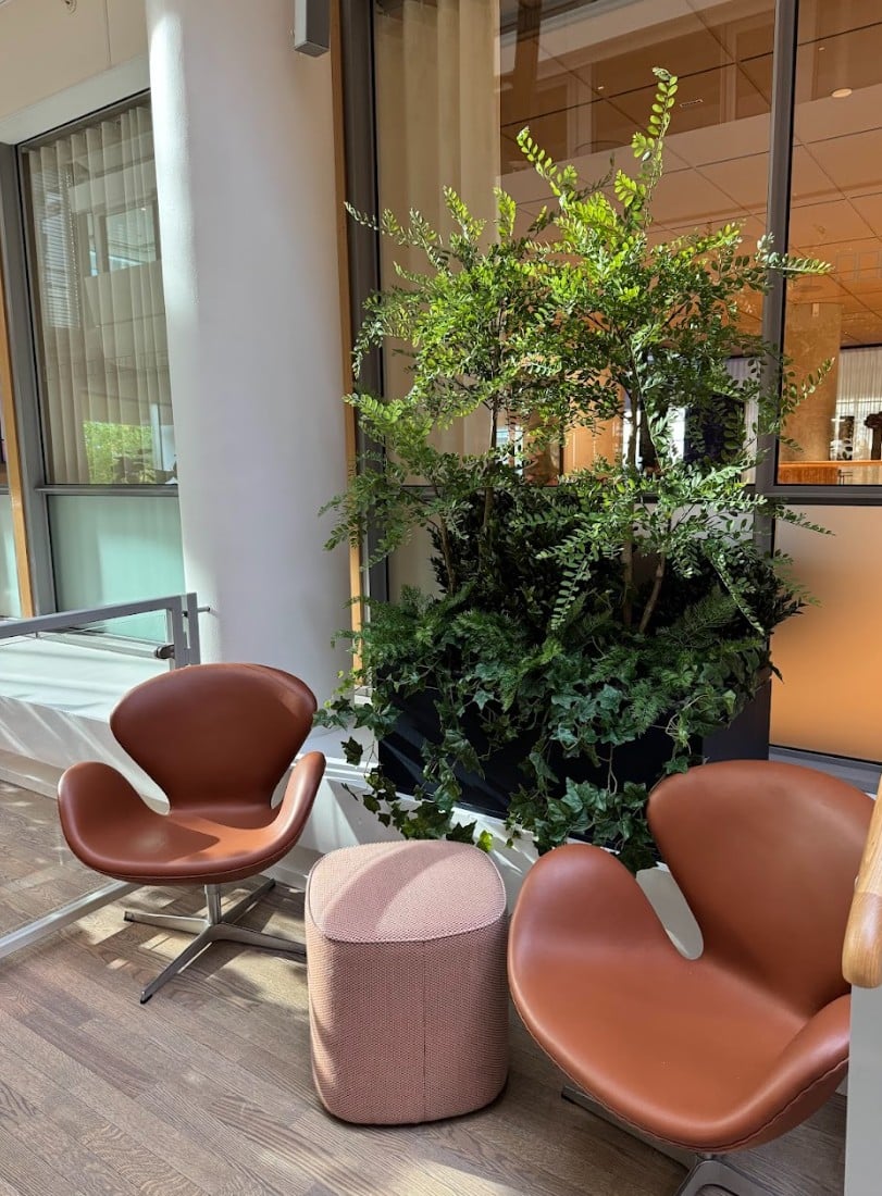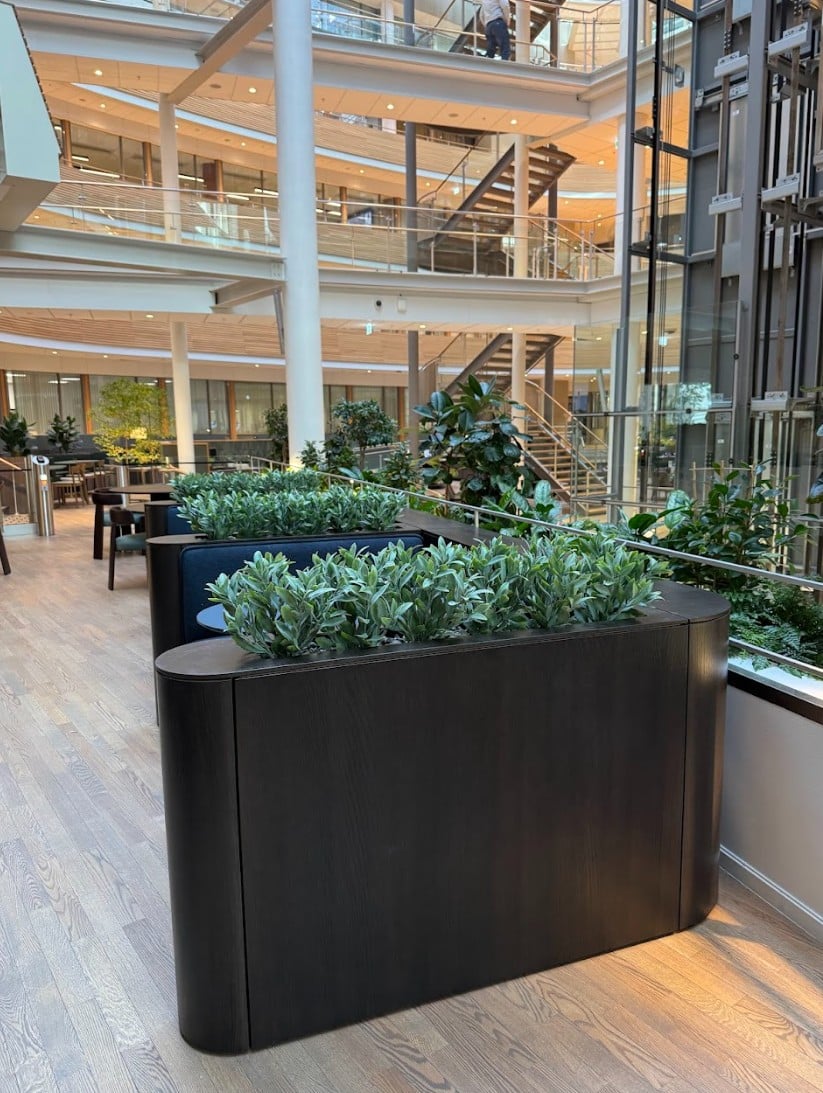 De nye lokalene til KPMG er så lekre! Her har vi plantet alt fra plantekasser som blir brukt som skillevegger i det åpne landskapet, potter i hyller, store bedd og grupper med potter og planter i sosiale soner.