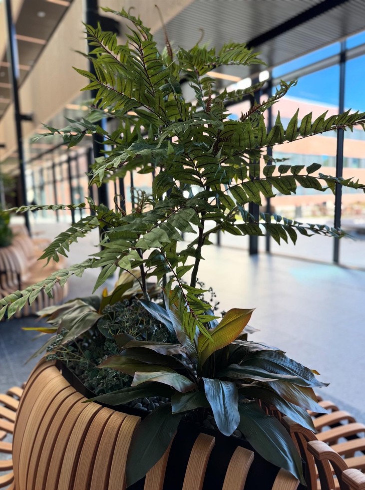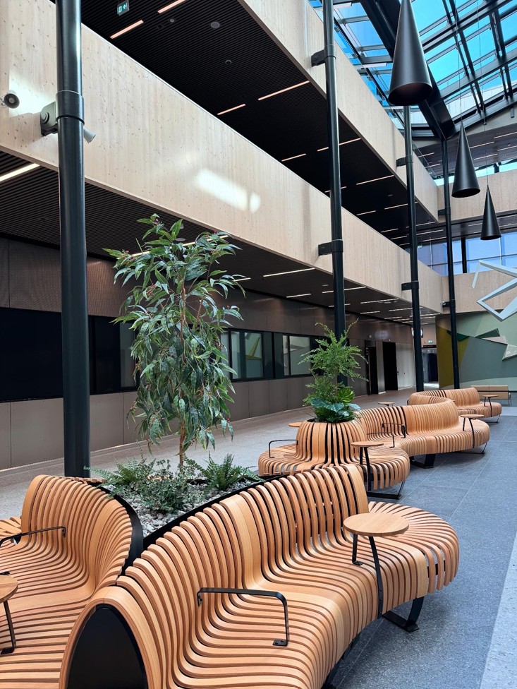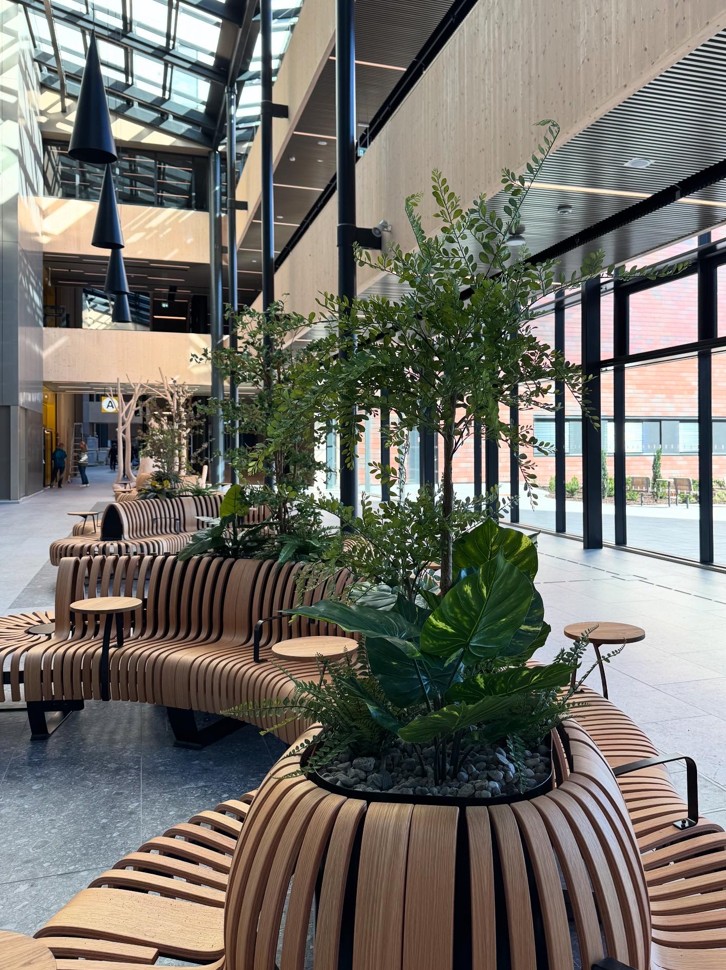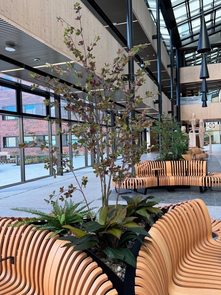 Det nye sykehuset i Drammen har blitt så fint! ❤️ Vi har gjort vårt for å skape grønne, hyggelige områder for pasienter og pårørende i Glassgata og kantinen. De flotte møblene i Glassgata er levert av Idema.