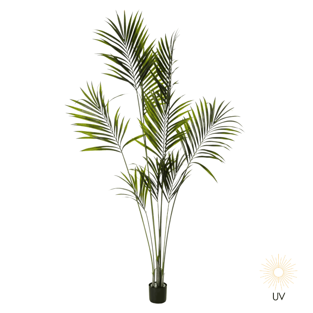 Kunstig Kentia palme, også kalt stråpalme og palmepalme. Uansett navn, Kentiapalmen er frodig og flott med sine lange spisse blader med en viss tykkelse.